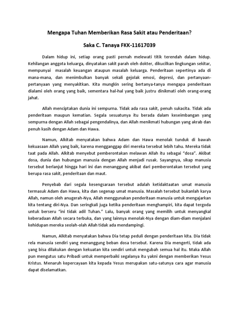 Kenapa allah memberi kita sakit. Tetapi ia kehilangan kesempurnaannya karena tidak menaati allah. Allah juga mengutus yesus untuk mati bagi dosa dosa kita. Allah pasti menyimpan hikmah di balik setiap sakit yang kita alami. Keempat sakit dapat menjadi jalan agar kita selalu ingat pada allah.