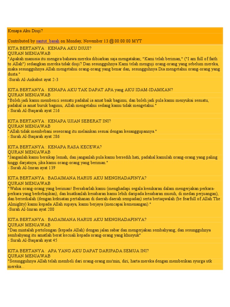Kenapa harus aku yang diuji. Adakah patut kamu menyangka bahawa kamu akan masuk syurga padahal belum sampai kepada kamu ujian dan cubaan seperti yang telah berlaku kepada orang orang yang terdahulu daripada kamu. Saat aku mencoba memposisikan diri sebagai dia rasanya aku tidak akan mampu bertahan dalam kondisi yang saat itu ia alami. Mungkin ujian yang hadir ini ialah sebagai turning point kita agar kembali kepadanya. Dan sesungguhnya kami telah menguji orang orang yang sebelum mereka maka sesungguhnya allah mengetahui orang orang yang benar dan sesungguhnya dia mengetahui orang orang yang dusta.