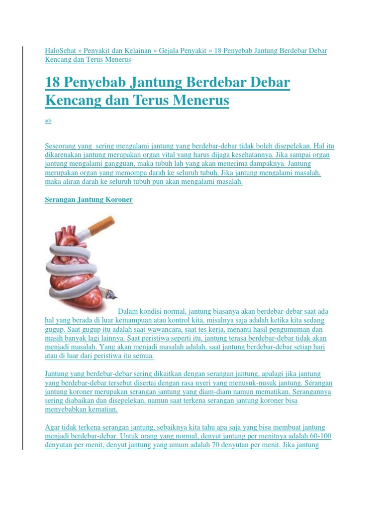 Penyebab jantung berdebar debar kencang terutama dikarenakan oleh berbagai macam penyakit seperti kolesterol asam urat lemak dan masih banyak lagi lainnya. Meskipun jantung yang berdebar kencang bisa mengkhawatirkan namun biasanya ini tidak berbahaya. Tanpa dirasakan jantung anda berdetak tiap saat. Ketika kita berjalan sendirian di malam hari tiba tiba ada semacam sesuatu melintas di belakang.