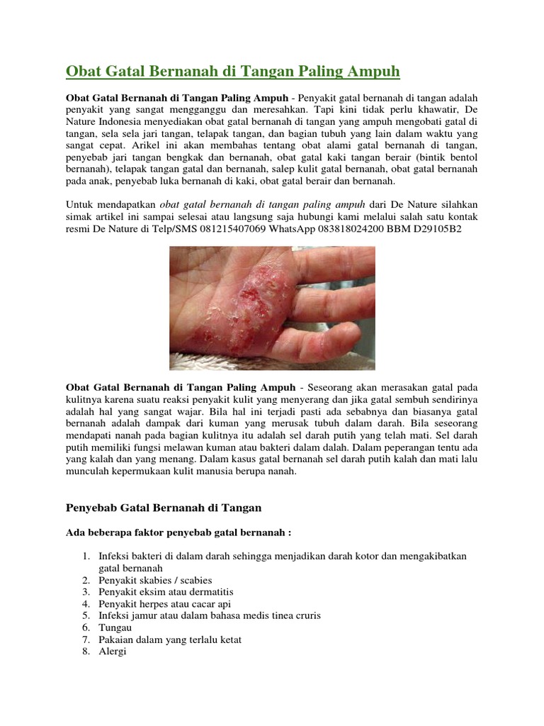 Luka terbuka yang berdarah jika tidak mendapatkan pengobatan yang tepat maka dapat mengakibatkan keluarnya nanah pada luka tersebut. Biasanya rasa gatal pada bekas luka terjadi akibat rangsangan fisik rangsangan kimia dan juga regenerasi atau proses perbaikan saraf. Ramuan obat alami untuk mengobati gatal luka bernanah berair dan bengkak ialah madu. Madu dapat mempercepat proses penyembuhan meminimalkan iritasi kulit dan gatal gatal.