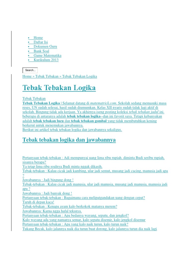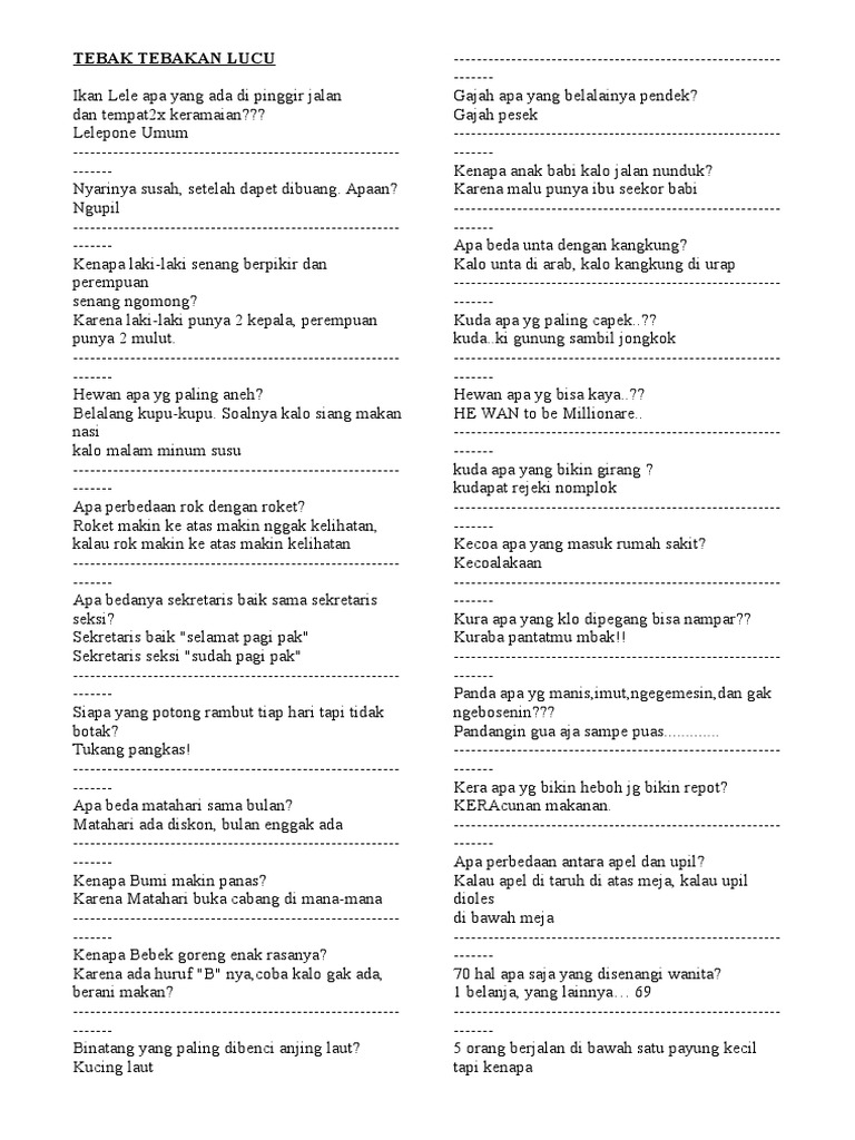 Selain itu pertanyaan lucu bisa mengasah kreativitas kamu dan orang sekitarmu untuk menjawab teka teki tersebut. Di era saat ini tebak tebakan seolah tidak ada matinya. Sekolah sedang memasuki masa reses un sudah selesai hasil sudah diumumkan. Kelas xii nyaris sudah tidak lagi aktif di sekolah.