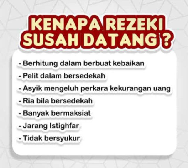 Bahwa ada 3 macam rezeki mereka adalah rezeki yang telah dijaminkan rezeki yang dibagikan dan rezeki yang. Dosa dikatakan sebagai perkara yang membuat rezeki susah datang sebagaimana yang dikatakan dalam berbagai riwayat. Mungkin jadi disebabkan dosa yang datang dari diri anda sendiri yang tak pernah sedar tak pernah mengaku tak pernah tahu dan tak pernah perasan. Jadi jika tanya orang yang kenal anda dekat ngan anda je boleh jawab apa keburukan yang anda dah buat.